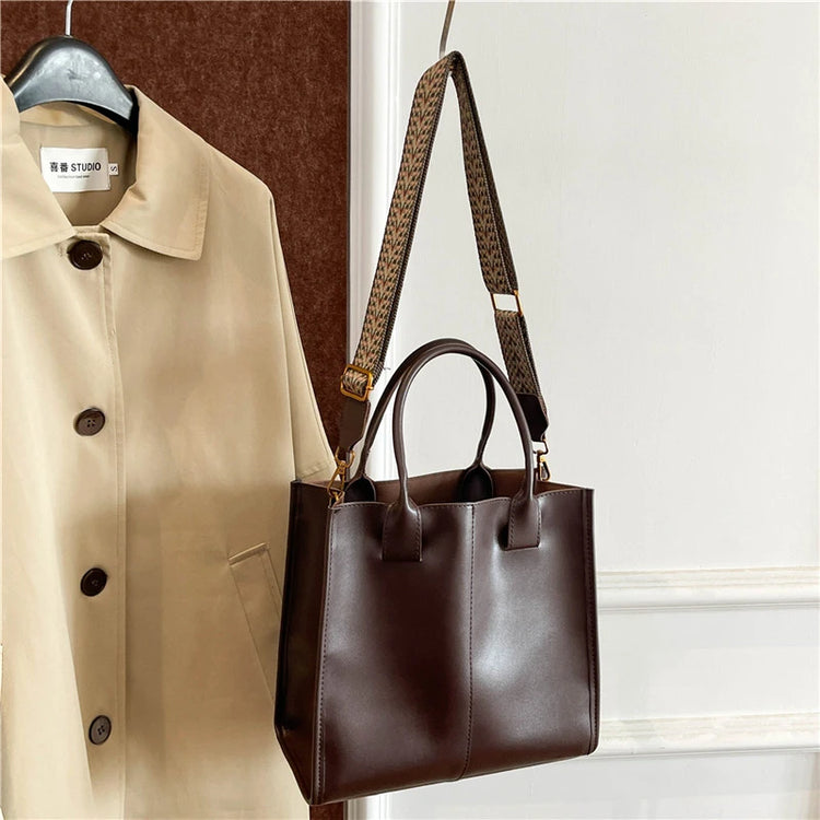This tote features a timeless silhouette and is available in versatile colors like classic Black and rich Coffee Brown. The main feature is the Wide Strap, which is both a fashion-forward detail and a functional upgrade, ensuring comfortable wear as a Shoulder Handbag, even when the bag is full.