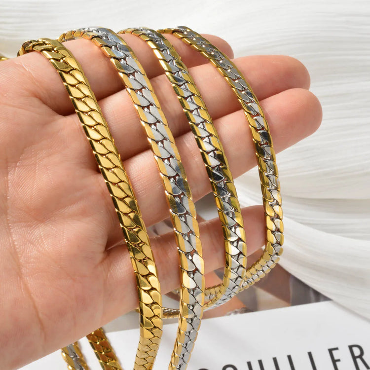 Available in versatile widths of 5mm, 6mm, or 7mm, this chain features a fluid, serpentine link design that is both stylish and comfortable to wear. Crafted from durable stainless steel, it offers exceptional longevity and a bright, high-shine finish that captures attention.